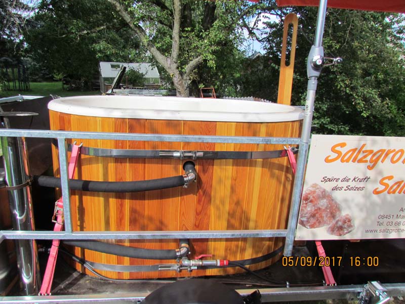 Gönnen Sie sich ein besonderes Wellnesserlebnis, in dem Sie unseren Badezuber zu sich nach Hause holen. An kalten Wintertagen, frischen Frühlingsabenden, lauen Sommernächten oder kühlen Herbsttagen - der Badezuber ist immer ein besonderes Erlebnis. Geheizt wird das Badefass mit einem Holzofen (35 kW), ein Wasseranschluß ist notwendig. Das Fass benötigt ca 820 l Wasser. Innerhalb von 1,5-2 Stunden erwärmt sich das Wasser auf 35-38 Grad. Das Badefass benötigt keinen Stromanschluß, da eine 50 A Batterie eingebaut wurde, dadurch kann das Fass außerhalb und im Wasser farbig beleuchtet werden. Im Badefass finden 2 Erwachsene und 2 Kinder bequem Platz. Holz für etwa 3 Stunden Badespaß ist inklusive.